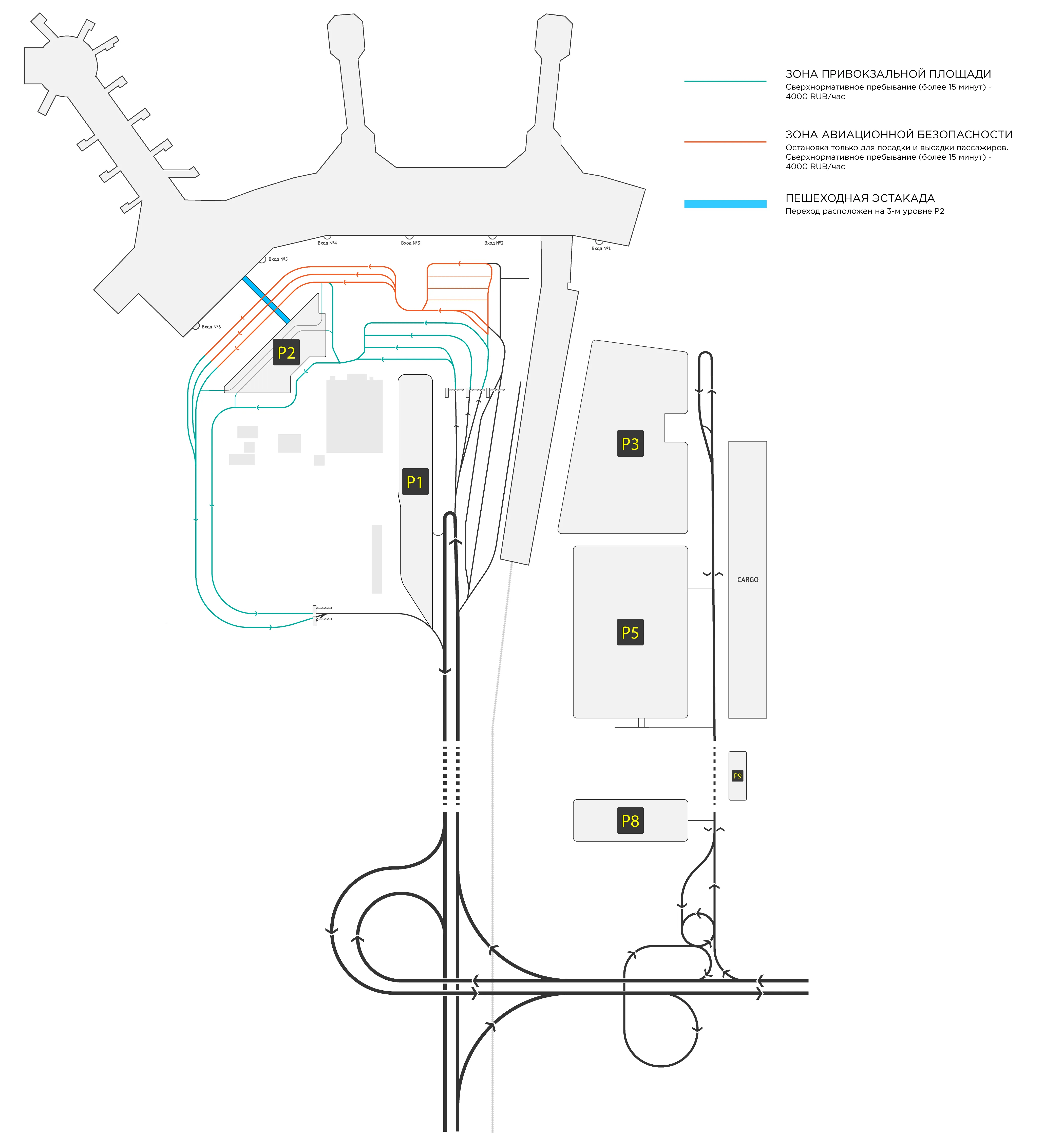 Парковка аэропорта работает ежедневно с 8:00 до 20:00. Бесплатно пребывать в зонах P4, P2 14 3011, P2 VIP, P2 COMFORT можно в течение 15 минут после въезда три раза в течение восьми часов. Стоимость нахождения на парковке начинается от 250 рублей в час, цена при оплате через мобильное приложение будет меньше. Если пассажир не оплатил парковку заранее и находится на территории парковки более 15 минут, он должен будет оплатить своё нахождение по ставке 4 000 рублей в час.