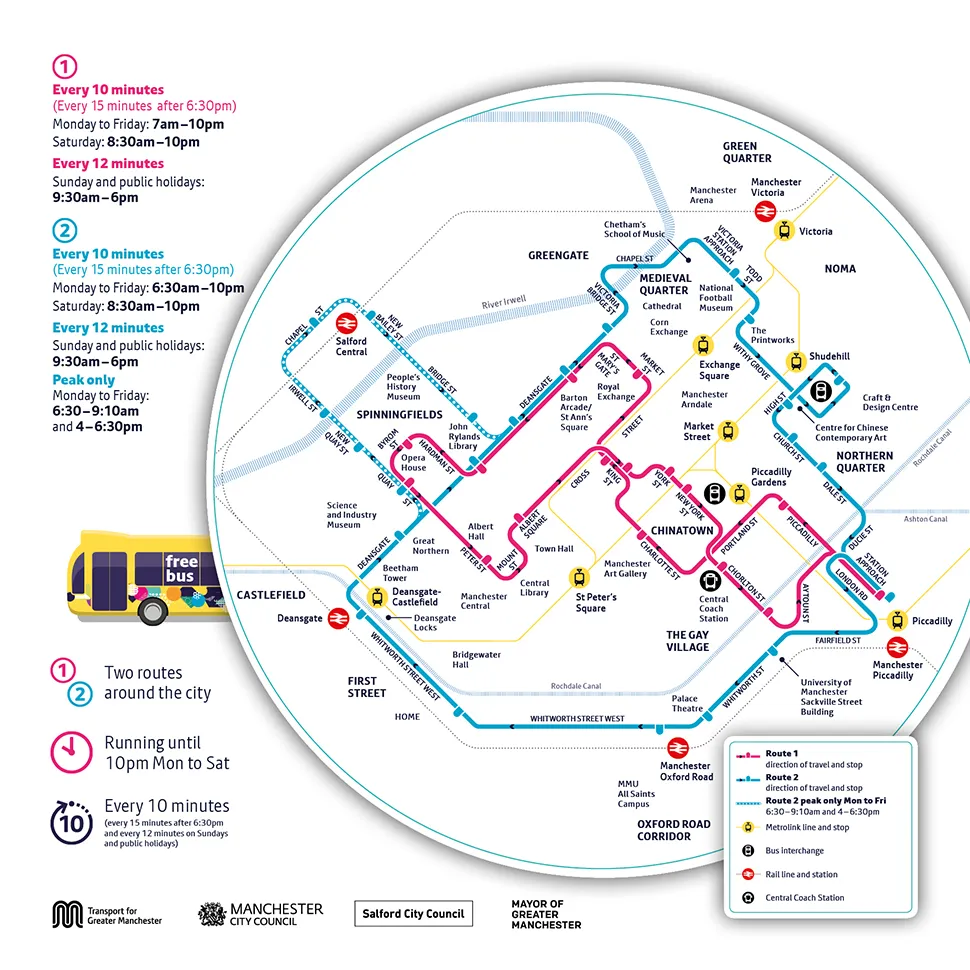 В Манчестере глаза разбегаются от красоты, но и за пределами города тоже есть интересные места. Чтобы без проблем добраться до пригородных станций, воспользуйтесь бесплатным автобусом Metroshuttle. Он ходит по двум маршрутам: