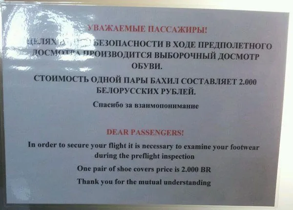 Да и сами службы иногда поражают, особенно тем как они подготовились к досмотру. Иногда доходит до комичных ситуаций, например в Минске за бахилы, которые во всех цивилизованных странах дают бесплатно, требуют деньги. Хотя это и не самый худший вариант, в некоторых аэропортах их вообще нету и приходится ждать своей очереди стоя на холодном и не всегда чистом полу.