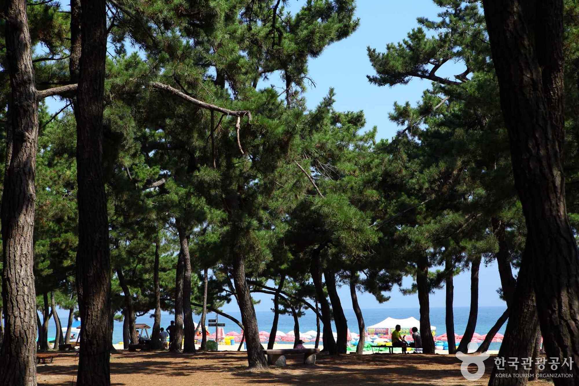 Пожалуй, самый известный и любимый пляж на восточном побережье Южной Кореи. Он простирается на 6 километров, образуя длинную полосу мягкого белого песка. А рядом ещё и располагается озеро Кёнпхохо, где можно покататься на лодке. Вода в море чистая и прозрачная, берег пологий, вдоль тянется сосновая роща, отчего в воздухе смешиваются смолы и соль морского бриза – сочетание получше любого селективного аромата! На пляже есть вся необходимая инфраструктура, включая туалеты, душевые, кабинки для переодевания, пункты проката зонтиков и шезлонгов, а также кафе и рестораны.