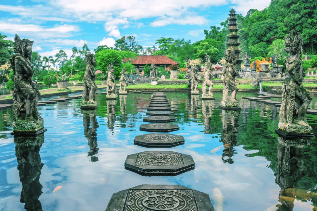 Дворец Тирта Ганга — это настоящий водный лабиринт с фонтанами и бассейнами. По всей территории возвышаются деревья, а постройки украшают каменные сооружения. Тут всегда свежо и красиво. Ну а для новых впечатлений предлагаем пройтись по каменным платформам через весь парк.