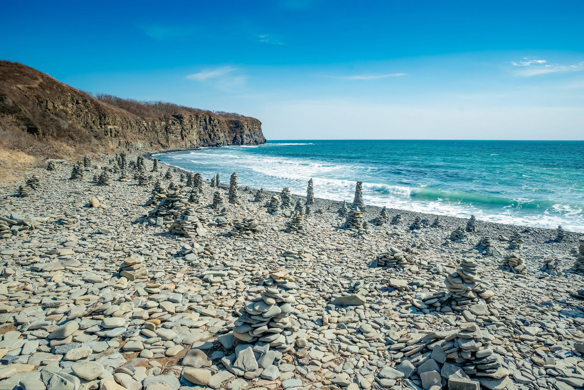 Начнём с самого уникального и известного пляжа Приморского края. История Стеклянной бухты выглядит неприглядно: стекольный завод, производство, свалка. Зато результат вышел удивительным. Теперь ради пляжа, усыпанного мелкими, обточенными морем, разноцветными стекляшками, сюда приезжают жители Владивостока и туристы. Инфраструктура развита слабо, скамеек и беседок ждать не стоит. А ещё не стоит увозить с собой стекло в качестве сувениров. Просто любуйтесь неожиданным результатом человеческой халатности, которую природа смогла превратить в нечто прекрасное.