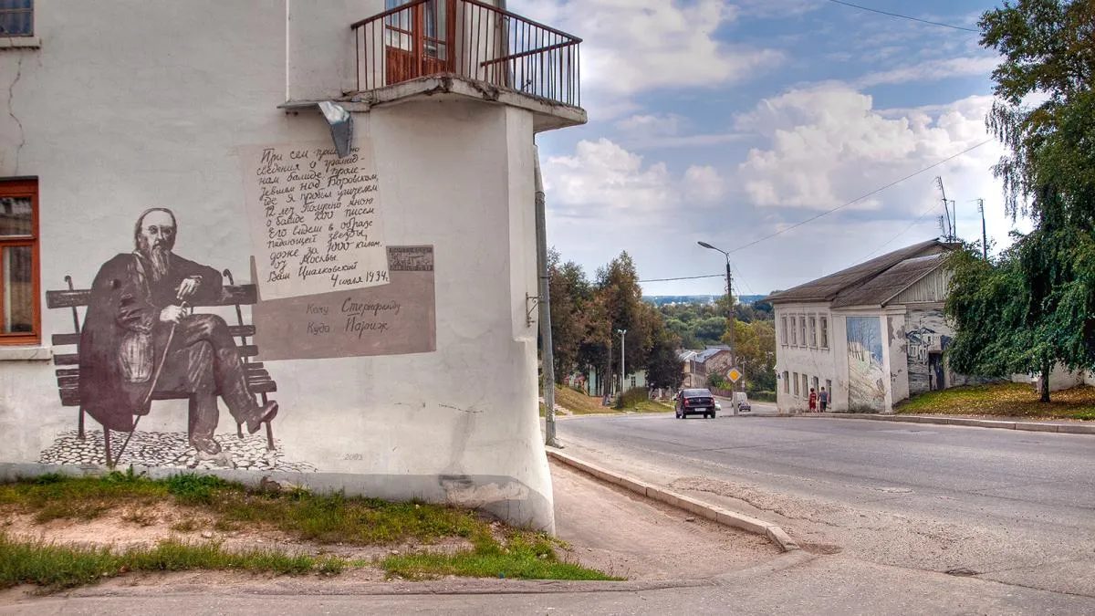 Город превратился в галерею под открытым небом благодаря художнику Владимиру Овчинникову. Он украсил стены домов фресками, на которых оживают исторические сюжеты, портреты известных жителей и стихи.