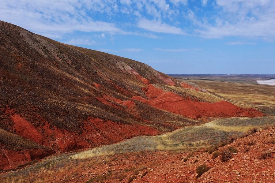 Единственная в Прикаспии настоящая гора посреди идеально ровной степи. Её склоны, сложенные из красного песчаника, и расположение рядом с солёным озером Баскунчак создают совершенно инопланетную картину.