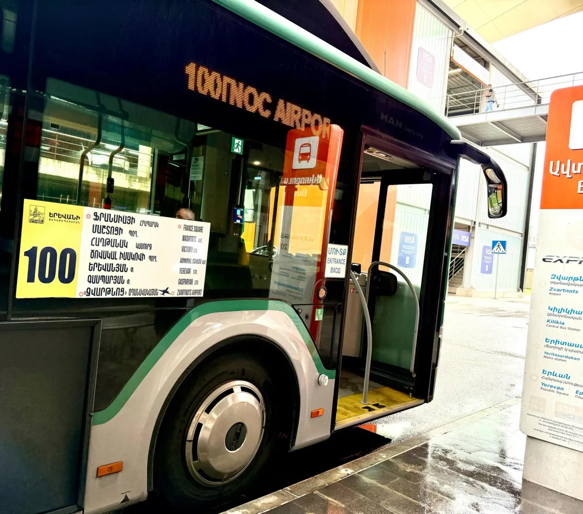 Добавим, что появился ещё маршрут №100, который ходит с 06:50 до 22:00 с интервалом каждые 30 минут, а с 22:00 до 06:50 – каждый час. Оплатить проезд можно через приложение TelCell, через терминалы TelCell или картой Visa и MasterCard непосредственно в транспорте. Четыре платежных терминала TelCell расположены в общественной зоне залов прилета и вылета. Маршрут следует прямо до площади Франции, откуда всего пару минут идти до Ереванского оперного театра и Каскада. Стоимость билета – 500 драм.