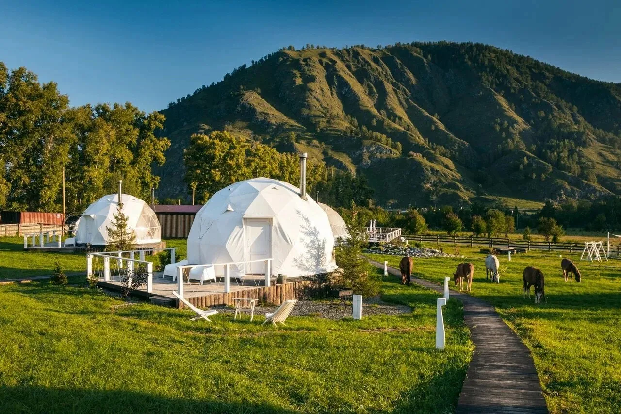 Алтай и геокуполы созданы друг для друга. Это идеальное и вместе с тем парадоксальное сочетание природы и футуризма, где похожие на половинки мячей домики рассыпаются по зелёным или белоснежным склонам, своими огромными окнами глядя на живописную долину реки Катунь. «Вдох» предлагает пятизвёздочный стандарт отдыха в месте, далеком от цивилизации. Учитывая разнообразие банных программ, отель вполне можно назвать алтайским спа-курортом: есть даже готовые оздоровительные туры на два или три дня. Каждый geo купол вмещает до трёх человек и располагает собственной открытой террасой.