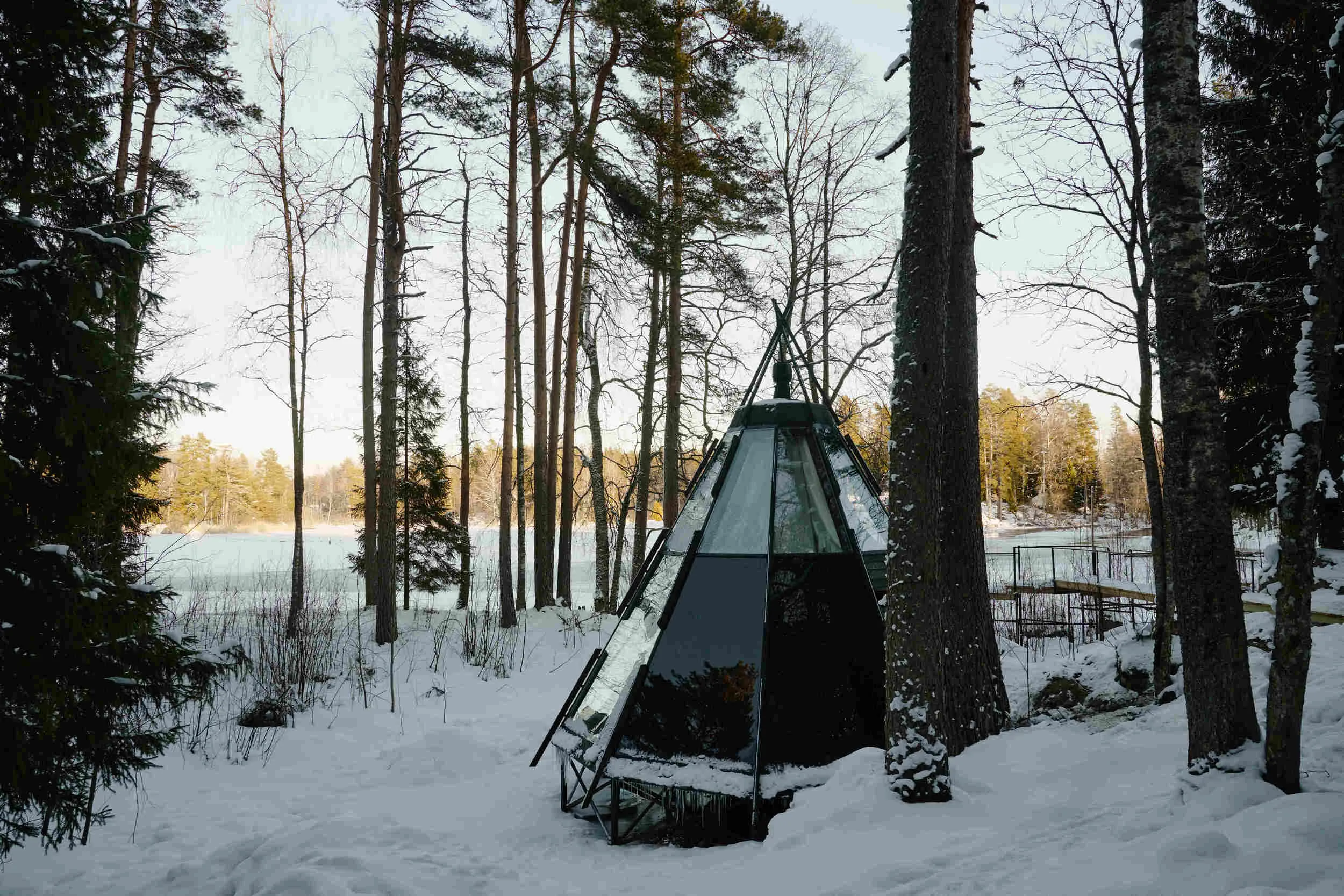 Создатели этого отеля постарались вписать его архитектуру в холодную, сдержанную красоту Карельского перешейка. Получилось очень скандинавски и северно – с большими окнами, в которых отражается небо, простыми линиями и ахроматической цветовой гаммой. Из каждого домика открывается панорамный вид на Вуоксу, а внутри – настоящее пространство для эстетов с «парящими» кроватями, лаконичной мебелью и обилием натурального дерева. Интересующие нас дома «Рейкьявик» своей формой напоминают «хижину викинга»: сквозь стеклянную крышу можно любоваться звёздами, а если повезет, то и северным сиянием.