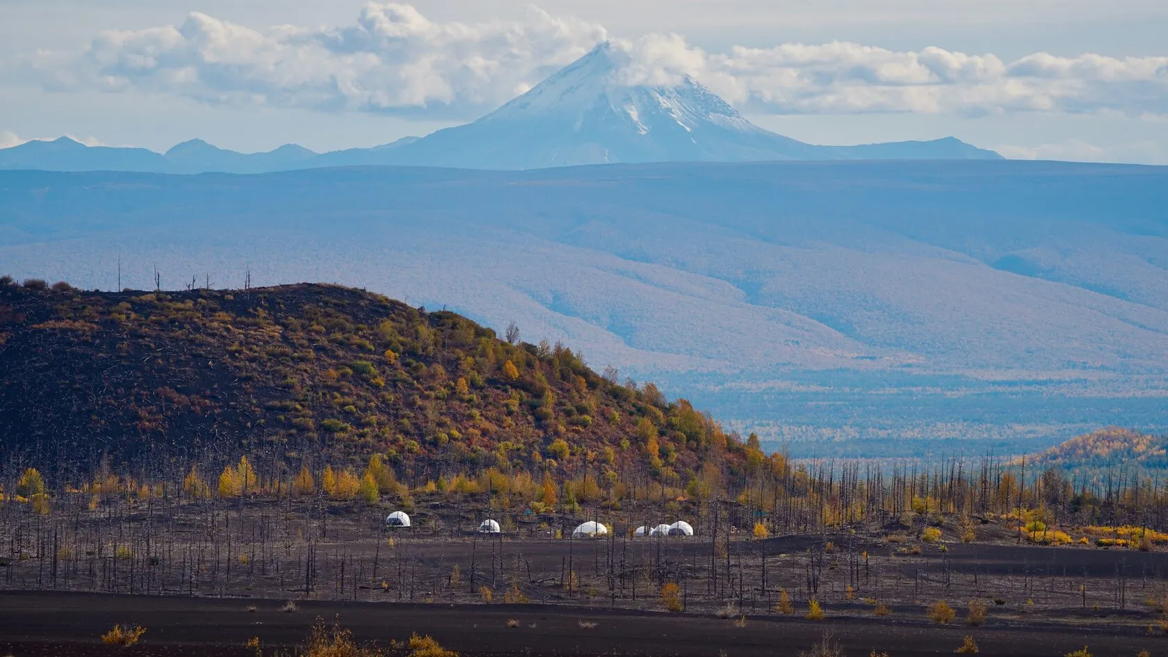 Представьте себе Марс, на который наконец высадились люди, и то, как стали бы выглядеть исследовательские станции. Представили? Вот примерно так можно описать Мёртвый лес у подножья действующего вулкана Толбачик, где расположились дома-шатры одноименного глэмпинга. Серо-чёрная земля, частокол из стволов деревьев и россыпь белоснежных куполов на фоне сопок. Завораживающее зрелище. Главное преимущество – близость к вулканам. Если вам нужны дополнительные идеи, чем заняться на Камчатке, читайте статью в нашем блоге.