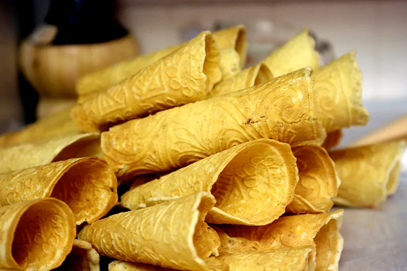 Норвежские крумкаке – это хрустящие, сладкие, скрученные вафельные печенья, которые в Норвегии традиционно делают на праздники. Для выпечки используется специальная форма, похожая на вафельницу. Её стенки украшены узором, который передаётся и готовому десерту. Сегодня крумкаке пекут в различных формах в зависимости от назначения. Например, трубочки и рожки можно начинить кремом – так будет ещё вкуснее.