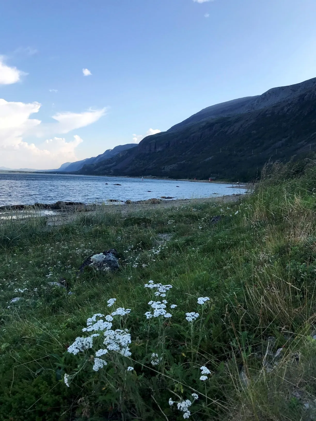 Мы специально выбрали дорогу, которая идёт вдоль береговой линии. Вышло дольше, зато виды божественные. Хоть и столбик термометра на солнце был близок к +30, в воде никого не было, да и ни одного цивилизованного пляжа нам не встретилось. Температурные рекорды за полярным кругом видимо случаются столь редко, что норвежцам и в голову не приходило купаться в Баренцевом море.