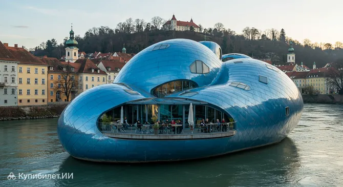 Муринзель (Murinsel) – это удивительный искусственный остров-мост, который украшает реку Мур в городе Грац, Австрия. Это футуристическое сооружение, напоминающее своей формой гигантское насекомое или куколку, быстро стало одной из самых узнаваемых и знаковых достопримечательностей города. Муринзель не просто арт-объект, а настоящее архитектурное чудо, привлекающее как местных жителей, так и туристов.