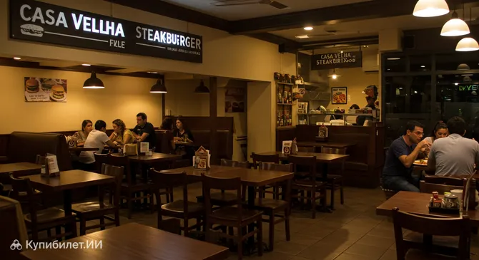 Заведение специализируется на сочных бургерах и стейках, что делает его популярным выбором среди местных жителей и путешественников, исследующих кулинарную карту региона. Интерьер и концепция «Casa Velha» (что можно перевести как «Старый дом») намекают на традиции и гостеприимство, характерные для такой страны, как Бразилия.