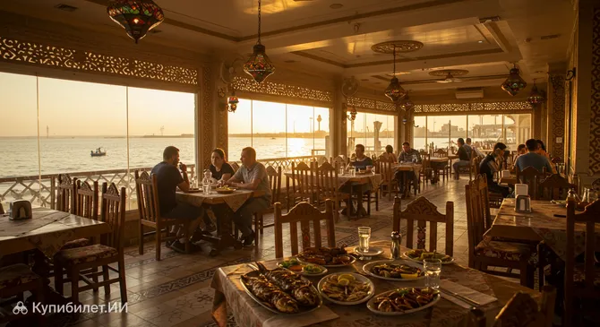 Помимо рыбы, в Суэце популярны классические египетские блюда: ароматный кушари, сытные бобы фуль медамес и свежеиспеченные лепешки. Из напитков местные жители предпочитают крепкий черный чай с мятой или каркаде. Культура еды здесь носит социальный характер: ужины в ресторанах часто затягиваются допоздна за неспешными разговорами и наблюдением за суетой портового города.