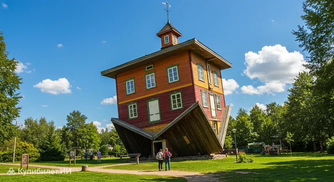 Особенность Дома вверх дном заключается не только в его необычном положении – он полностью опирается на крышу, – но и в том, что всё строение установлено под углом в девять градусов. Такой наклон усиливает эффект дезориентации и заставляет вестибулярный аппарат работать на полную, превращая обычную прогулку по комнатам в увлекательное и немного головокружительное приключение.