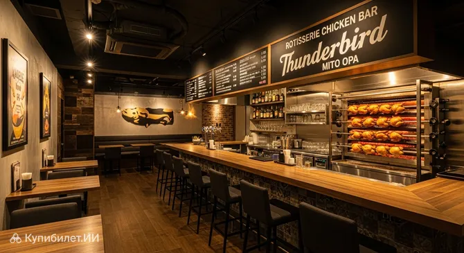 Бар-гриль с цыпленком на вертеле Thunderbird, Мито ОPA. Иллюстрация.