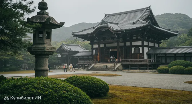 Архитектура храма Дайдзю-дзи представляет собой великолепный образец традиционного японского зодчества. Посетителей встречают характерные для буддийских храмов деревянные конструкции, изящно изогнутые крыши и утонченные детали декора. Хотя точные размеры храма не всегда указываются, очевидно, что при его строительстве использовались традиционные японские техники, возможно, схожие с методом kizukuri, который предполагает применение массивных деревянных балок и колонн, создавая ощущение мощи и гармонии.
