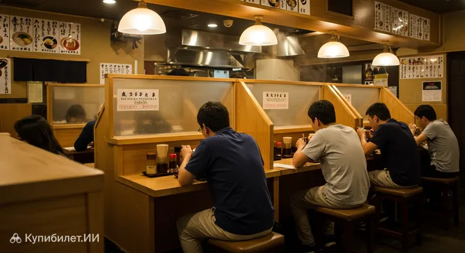 Рамен в тишине для гурманов: Один из самых известных рамен-ресторанов в Сибуе, Итиран, прославился не только своим насыщенным бульоном и вкусной лапшой, но и уникальной концепцией «кабинок для концентрации на вкусе». Посетители едят в индивидуальных отсеках, чтобы ничто не отвлекало их от наслаждения блюдом. Эта система была разработана для максимального погружения в гастрономический опыт.