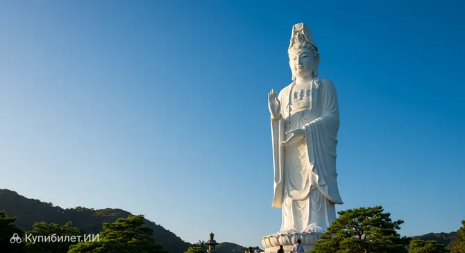 Статуя поражает своими размерами: ее высота достигает 41,8 метра, а вес составляет почти 6000 тонн. Название "Бякуэ", означающее "белое одеяние", отражает белоснежный цвет изваяния, символизирующий чистоту и сострадание. Каннон, или Гуаньинь, является одной из наиболее почитаемых бодхисаттв в японском буддизме, воплощая безграничное милосердие ко всем живым существам.