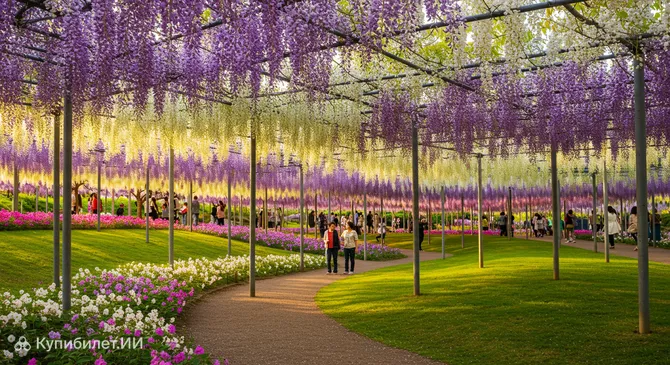Главная гордость парка — это, без сомнения, великолепные глицинии, возраст некоторых из которых превышает 150 лет. Посетители могут прогуляться по знаменитым цветочным тоннелям, где с арок свисают тысячи гроздей сиреневых, розовых, белых и даже редких желтых оттенков. Фотографии этих волшебных коридоров и огромного дерева глицинии, крона которого напоминает гигантский зонт, разошлись по всему миру, сделав парк местом паломничества для фотографов и ценителей прекрасного.