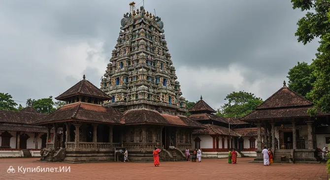Архитектура Храма Шри Пурнатрайеса — это настоящее воплощение традиционного стиля Кералы. Посетителей встречает характерная многоярусная крыша, искусная резьба по дереву, украшающая каждый уголок, и расписанные стены, повествующие древние легенды. Каждый элемент храмового комплекса отражает глубокие культурные традиции и мастерство местных зодчих.
