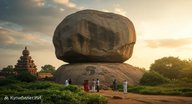 В прибрежном городе Махабалипурам, что находится в Индии, есть удивительное природное чудо, которое привлекает путешественников со всего мира — Кришна-Баттерболл (Krishna's Butterball). Это гигантский гранитный валун весом около 250 тонн, высотой примерно 6 метров и шириной 5 метров, который кажется застывшим во времени. Он балансирует на гладком скалистом склоне под таким углом, что, кажется, вот-вот покатится вниз, но при этом остается неподвижным на протяжении вот уже более 1200 лет.