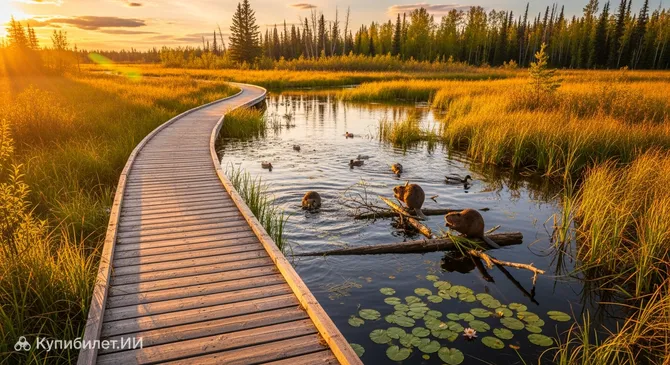 Представьте себе уникальное природное пространство, где человек может прикоснуться к жизни дикой природы, не нарушая её границ. Бобровый настил (Beaver Boardwalk), расположенный в городе Хинтон, — это именно такое место. Канада гордится этой достопримечательностью, ведь это самый длинный в мире настил над пресноводным болотом, протяженность которого составляет более 3 километров.