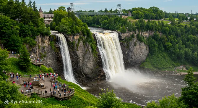 Ниспадая в реку Святого Лаврентия, водопад создает завораживающую картину, которую можно наблюдать с разных ракурсов. Для посетителей оборудованы смотровые площадки, канатная дорога и даже подвесной мост, перекинутый прямо над бурлящим потоком, откуда открываются захватывающие виды. Шум ревущей воды и облака водяных брызг, в которых в солнечную погоду играет радуга, оставляют незабываемое впечатление.