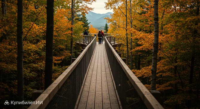 Тропа на вершинах деревьев Лорантидов – это удивительный экологический аттракцион, который ждет вас в живописном Мон-Тремблане, в сердце Канады. Представьте себе специально оборудованную пешеходную тропу, которая плавно вьется сквозь густой лес, постепенно поднимаясь к самым верхушкам могучих деревьев. Это уникальная возможность насладиться первозданной природой Лаврентийских гор с совершенно необычного ракурса, почувствовав себя частью лесной экосистемы.