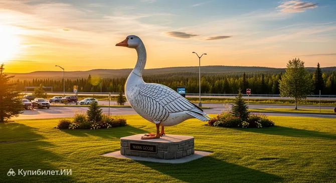 Представьте себе величественную птицу, застывшую в полете над бескрайними просторами Онтарио — это знаменитый Гусь в Ваве. Этот уникальный арт-объект представляет собой гигантскую девятиметровую статую канадской казарки, которая стала настоящей визитной карточкой, которую с гордостью представляет Вава. Вес этой впечатляющей металлической конструкции составляет около 2600 кг, что делает ее одной из самых больших скульптур подобного типа в мире.
