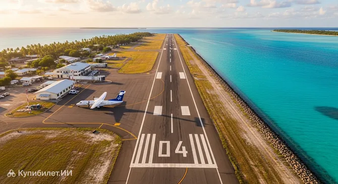- Невероятные виды при посадке: Поскольку взлетно-посадочная полоса занимает значительную часть узкого острова, при снижении пассажирам открываются захватывающие панорамы коралловых рифов и бесконечного океана буквально под крылом самолета.