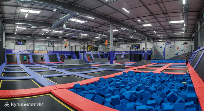 Внутри комплекса гостей ждет огромная зона с батутами различной конфигурации: от классических горизонтальных до наклонных, предназначенных для выполнения сложных трюков. Здесь предусмотрены безопасные поролоновые ямы для мягких приземлений и специальные площадки для командных состязаний, что делает это место идеальным для выброса адреналина.