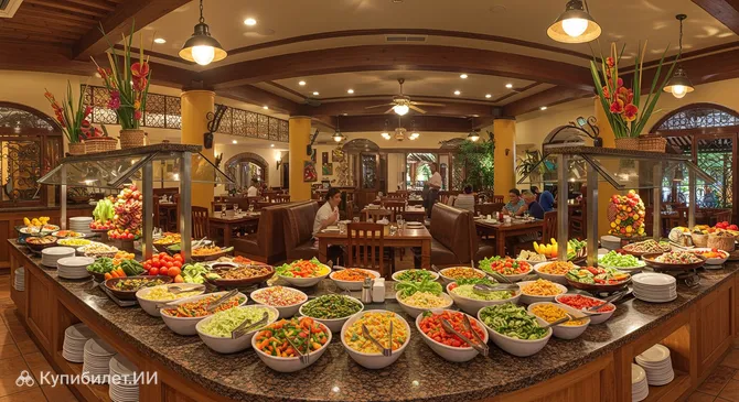 Особенность заведения заключается в уникальной концепции «шведского стола», дополненной подачей премиальных мясных нарезок. Официанты перемещаются по залу с шампурами, предлагая гостям различные виды мяса, приготовленного на гриле. Чтобы вы могли управлять процессом, на столах установлены специальные светофоры: зеленый свет сигнализирует о готовности пробовать новое блюдо, а красный — о желании сделать перерыв.
