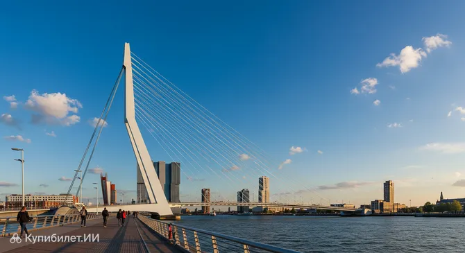 Эразмусбрюг (Erasmusbrug), или Мост Эразма, — это одна из самых знаковых и узнаваемых достопримечательностей Роттердама и всех Нидерландов. Этот изящный вантовый мост, перекинутый через реку Маас, соединяет северную и южную части города, являясь не просто важной транспортной артерией, но и настоящим архитектурным символом современного Роттердама. Его открытие состоялось в 1996 году, и с тех пор он стал неотъемлемой частью городского пейзажа.