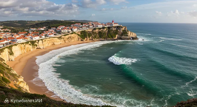 Пляж Назаре — это главная прибрежная жемчужина города Назаре, расположенного в Португалии. Он представляет собой широкую песчаную полосу в форме полумесяца, которая протянулась примерно на 1,7 км между городской гаванью и величественной скалой. Это место славится своим золотистым мягким песком и развитой инфраструктурой, что делает его идеальным как для спокойного семейного отдыха, так и для активных туристов. Летом здесь устанавливают яркие навесы, которые создают комфортную тень и красочный контраст с синевой Атлантического океана.