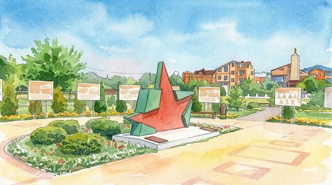 На территории площадью около 2 гектаров высажено более 600 деревьев, включая величественные ели, кипарисы и знаменитые сосны, создающие приятную тень в жаркие дни. В центре внимания посетителей находится уникальный двухметровый монумент в форме красной звезды, возвышающейся над солдатской гимнастеркой. Мемориальную атмосферу дополняют информационные стенды, рассказывающие о подвигах города в годы войны, и братская могила героев-защитников.