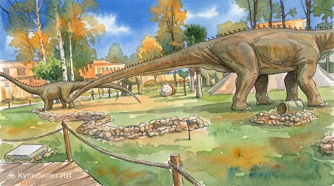 Атмосфера парка продумана до мелочей: искусственные пальмы, дымящиеся вулканы и стилизованные декорации переносят гостей в мир мезозоя. Это не просто выставка фигур, а полноценная зона семейного отдыха, где образовательная составляющая гармонично сочетается с активными развлечениями и творческими мастер-классами под открытым небом.