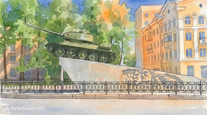 Особое внимание привлекают художественные рельефы на сторонах постамента. На одной из них запечатлены образы тружеников тыла — старика, женщины и подростка, которые работали на пределе сил ради общей цели. С другой стороны изображены советские воины. Этот памятник — не просто военная техника на пьедестале, а глубокая дань уважения тем, кто ковал победу в заводских цехах.