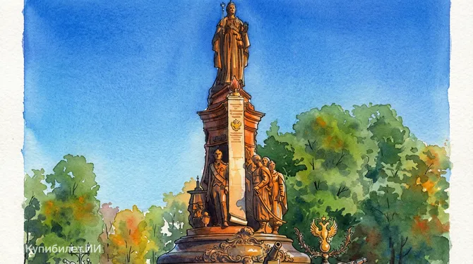 Конструкция поражает своими масштабами: высота монумента достигает почти 14 метров, а на его создание ушло около 25 тонн бронзы и 80 граммов сусального золота. В центре композиции — фигура мудрой Екатерины Великой в императорской порфире, со скипетром и державой в руках. У подножия постамента запечатлены знаковые исторические личности: князь Потемкин-Таврический и первые атаманы Черноморского казачьего войска.
