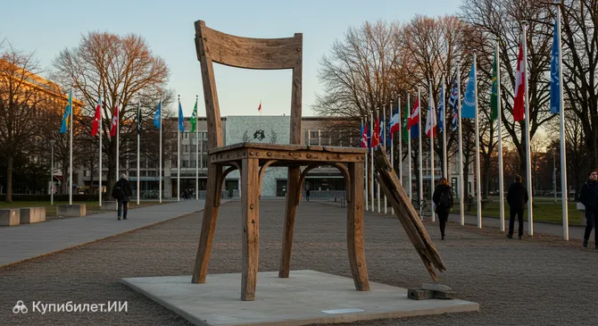 Сломанный стул (Broken Chair) – это впечатляющая монументальная скульптура, ставшая одним из самых узнаваемых символов Женевы, города в Швейцарии. Расположенная на Площади Наций (Place des Nations), прямо напротив главного входа в Европейское отделение ООН, эта 12-метровая деревянная конструкция сразу приковывает взгляд своим необычным и запоминающимся видом.