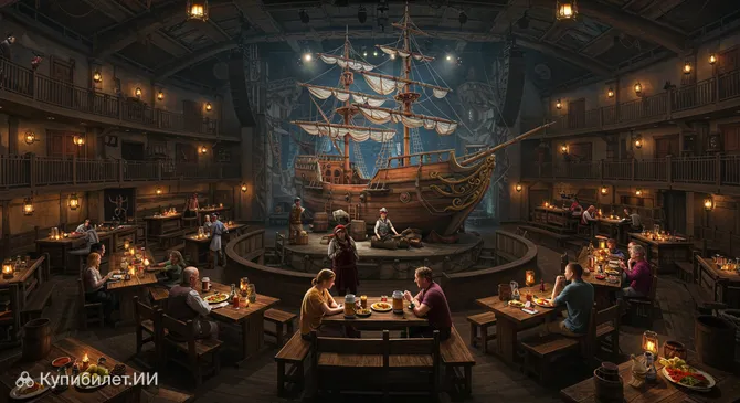 Представьте себе: вы располагаетесь вокруг огромной арены, которая искусно оформлена в виде настоящего пиратского корабля. Высокие мачты, развевающиеся паруса и аутентичная морская атмосфера создают полное ощущение присутствия на борту судна, готового отправиться в полное опасностей приключение. Это не просто декорации, а целый мир, оживающий на ваших глазах.