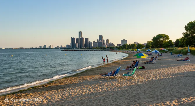 Расположенный на живописном острове посреди реки Детройт, **Пляж Белл-Айл** является одной из самых любимых зон отдыха для жителей и гостей США. Этот песчаный берег протяженностью около 800 метров предлагает уникальную возможность насладиться природой, не покидая границ крупного индустриального центра.