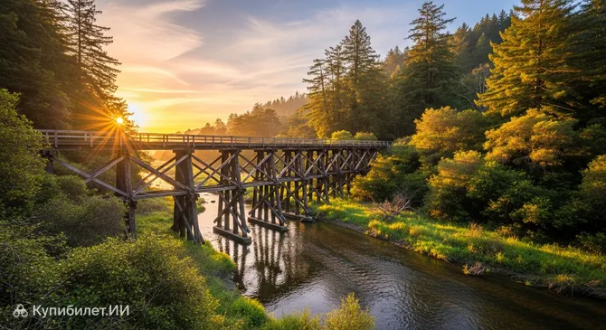 На скалистом побережье, где волны Тихого океана с силой разбиваются о берег, возвышается Виадук Паддинг-Крик. Это впечатляющее историческое сооружение в городе Форт-Брэгг представляет собой массивный деревянный железнодорожный мост, ставший одной из самых узнаваемых достопримечательностей штата Калифорния, США.