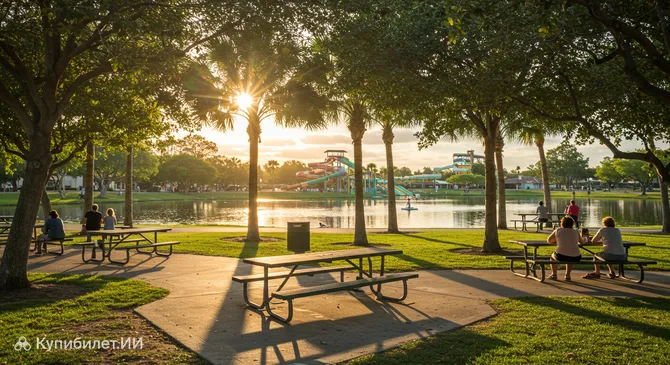 Среди многочисленных развлечений, которые предлагает парк, особенно выделяется впечатляющий водный парк с большими водными горками, идеальный для спасения от флоридской жары. Кроме того, на территории парка оборудованы специальные зоны для кемпинга, многочисленные спортивные площадки для различных видов игр, а также уютные места для пикников и неспешных прогулок по ухоженным тропам.
