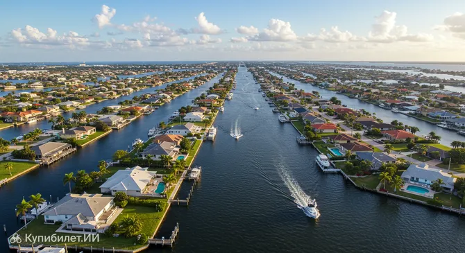 Кейп-Корал — это настоящий тропический рай, уютно расположившийся на юго-западном побережье штата Флорида в США, у Мексиканского залива. Этот город по праву называют "городом на воде" благодаря его самой выдающейся особенности — уникальной сети судоходных каналов. Их общая протяженность превышает 640 километров, что даже больше, чем в знаменитой Венеции! Практически каждый дом здесь имеет выход к воде, а лодочные прогулки являются неотъемлемой частью местного образа жизни.