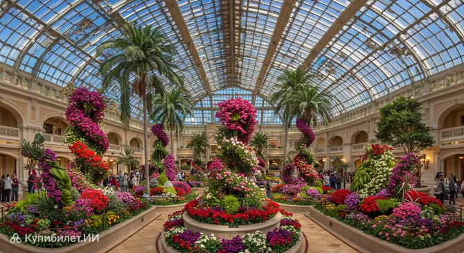 Оранжерея и ботанические сады в Лас-Вегасе — это одна из самых известных и впечатляющих достопримечательностей города, расположенная на территории знаменитого отеля Bellagio. Это не просто сад, а настоящее произведение искусства, где тысячи живых растений и цветов со всего мира, собранные в эффектные композиции, создают оазис красоты в самом сердце одного из самых динамичных городов США.