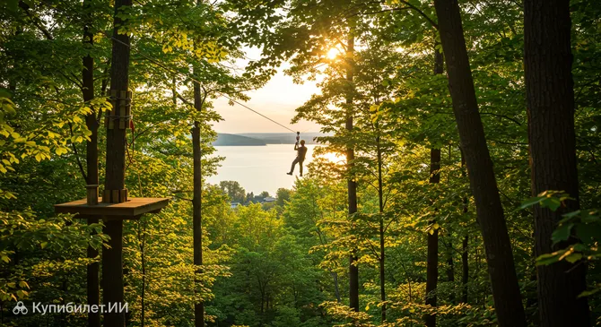 Верёвочный парк и зиплайн на озере Женева — это захватывающий центр приключений под открытым небом, расположенный в живописном уголке города Лейк-Женева, США. Этот парк представляет собой уникальное сочетание активного отдыха и погружения в природу, предлагая гостям экотуры по кронам деревьев на огромной территории в 100 акров лесного массива.
