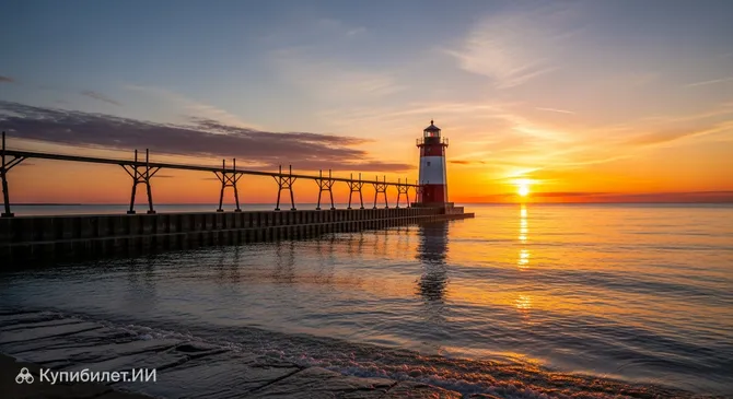 Расположенный на живописном северном побережье озера Мичиган, Восточный моловый маяк Манистик является одной из самых узнаваемых достопримечательностей города Манистик. Этот исторический объект в США представляет собой классическую 12-метровую башню с белым корпусом и ярко-красной крышей, которая возвышается на самом краю длинного волнореза.
