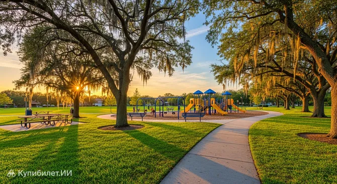 Площадка представляет собой многофункциональную зону для активного досуга и спокойного времяпрепровождения под сенью раскидистых деревьев. Здесь созданы все условия для того, чтобы отвлечься от городской суеты, заняться спортом или устроить семейный пикник на свежем воздухе в окружении флоридской зелени.