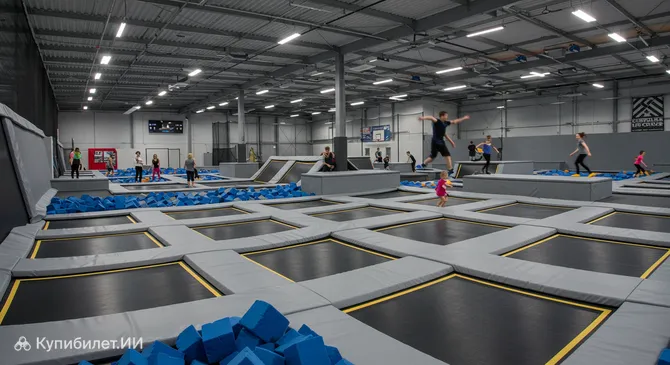Основная особенность парка — его масштабные арены, где батутное полотно покрывает не только пол, но и стены. Это создает уникальную среду для активного отдыха, где можно не просто прыгать, но и буквально бегать по стенам. С рейтингом 4.3 и множеством положительных отзывов, это место по праву считается одним из лучших вариантов для семейного досуга в регионе.