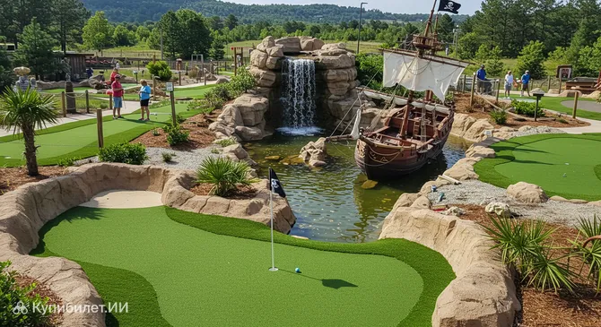 Представьте себе мир, где среди пышной зелени и каскадных водопадов оживают легенды о морских разбойниках. Пиратская бухта Мини-гольф (Pirate's Cove Adventure Golf) в городе Рапид-Сити — это не просто спортивная площадка, а настоящее интерактивное приключение в стиле XVIII века. Расположенный в штате Южная Дакота, США, этот тематический парк предлагает гостям погрузиться в атмосферу пиратских странствий.